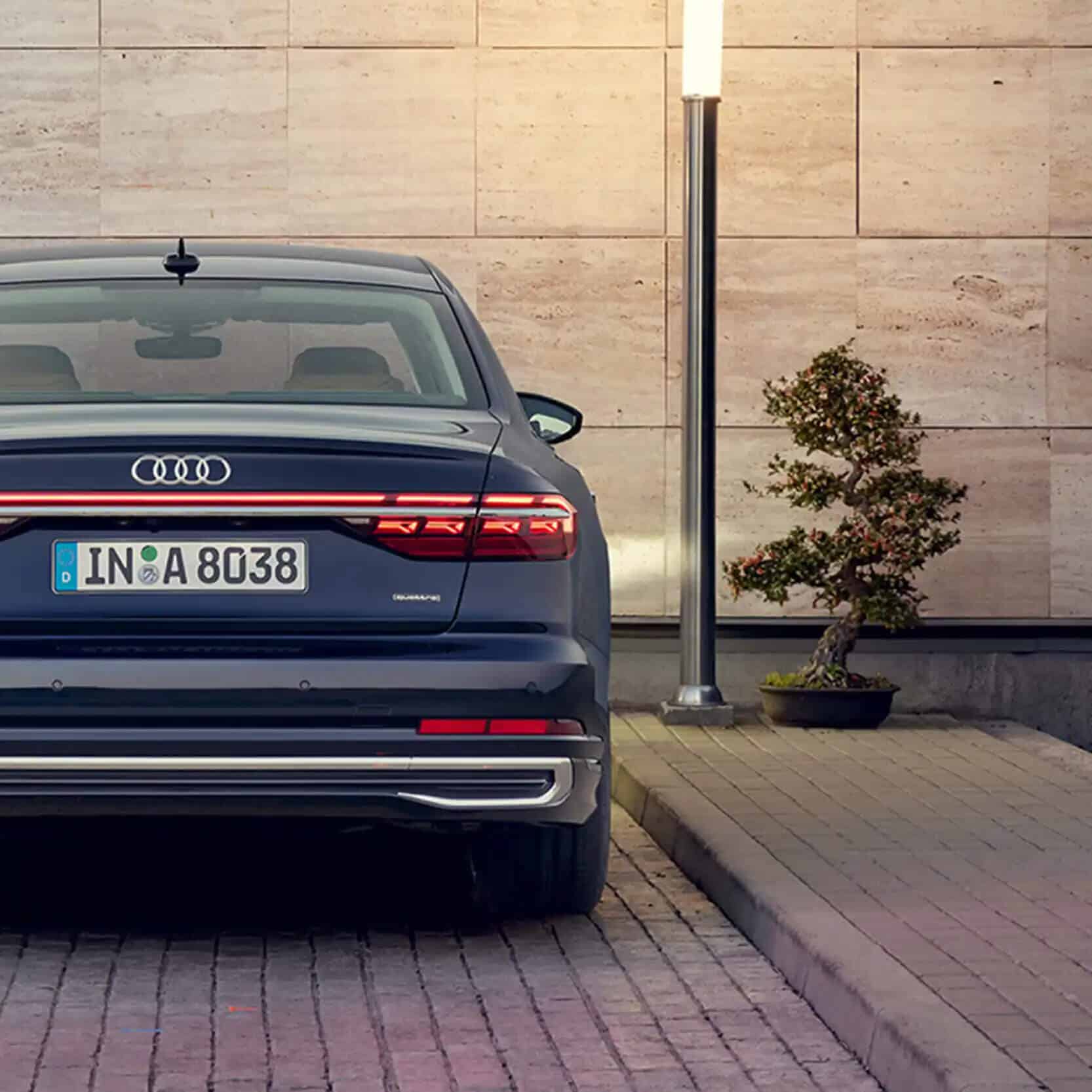 Il posteriore della nuova Audi A8 L risalta grazie al design rinnovato delle luci posteriori a tecnologia OLED e al pacchetto esterni