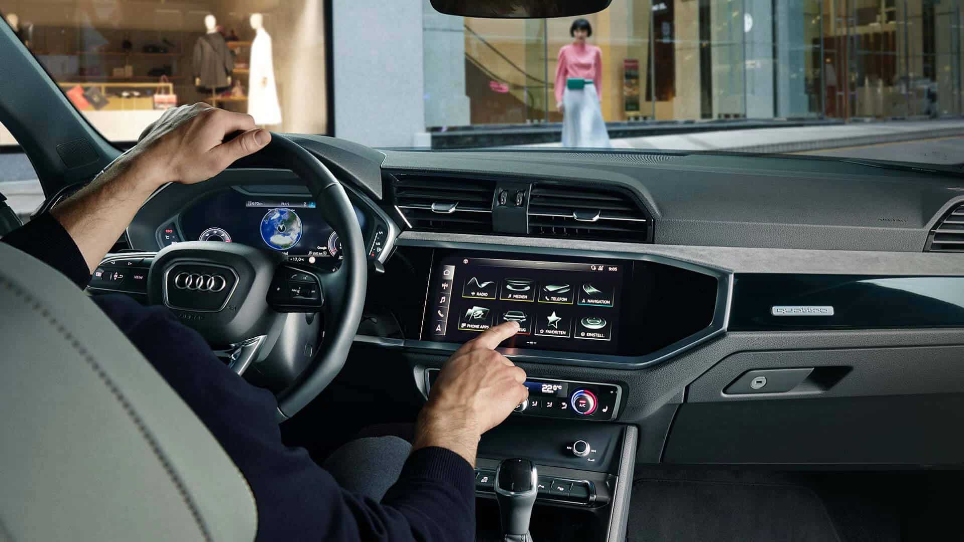 Nell’Audi Q3 Sportback, l’equipaggiamento di serie include l’Audi virtual cockpit da 10,25”, ma potete anche optare per l’Audi virtual cockpit plus con un display HD da 12,3”, in grado di fornire informazioni personalizzate sul veicolo. Con l’MMI touch, tramite un display da 10,1” nella console centrale, potete controllare l’MMI navigation plus, incluso di serie dal secondo livello di allestimento. Inoltre, grazie alle diverse interfacce USB-C e alla connessione, inclusa l’Audi smartphone interface di serie dalla versione Business Plus, potete collegare i vostri dispositivi mobili⁴ al veicolo. Tutto questo è accompagnato da una vasta gamma di servizi Audi connect.