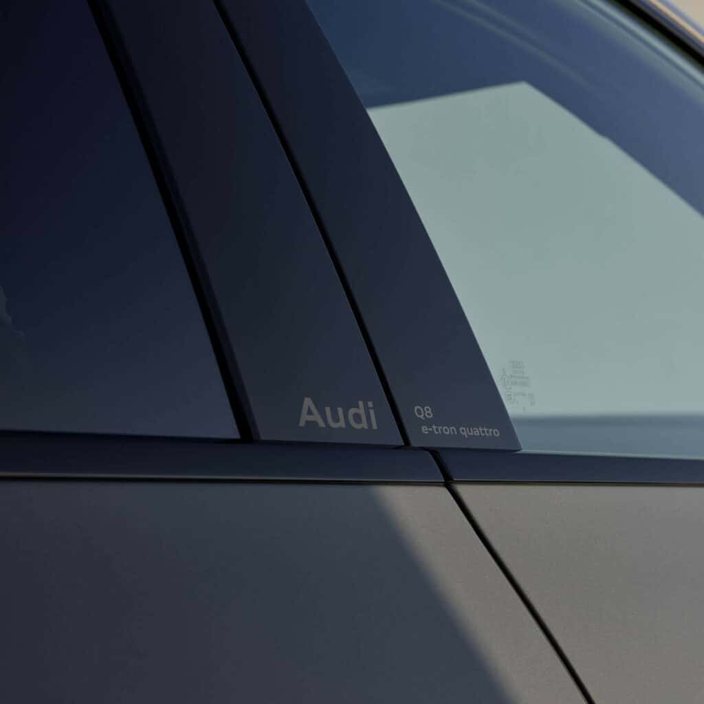 L’Audi Q8 e-tron è il primo veicolo a presentare la nuova corporate identity, riconoscibile dal rinnovato logo degli anelli Audi e dalla denominazione del modello sui montanti centrali.