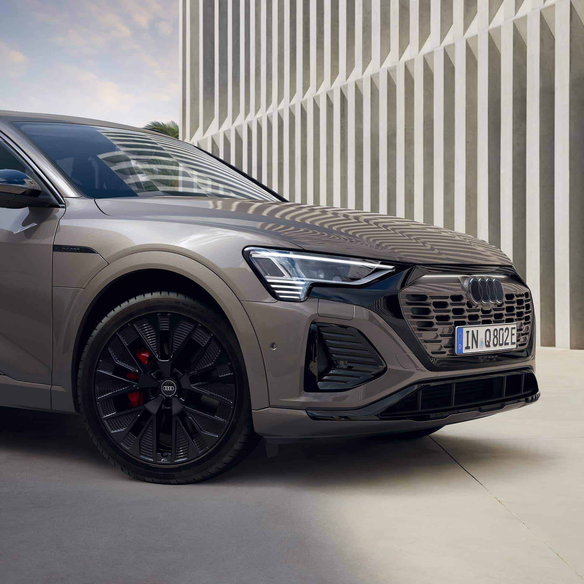 Audi Q8 e-tron è il primo veicolo a esibire la nuova corporate identity riconoscibile dal look rinnovato degli anelli Audi e dalla denominazione modello sui montanti centrali.