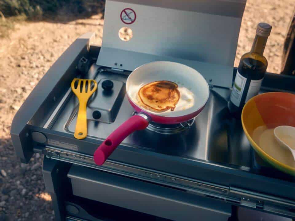 La cucina posteriore del Caddy California è progettata per offrirti praticità ovunque tu vada. I cassetti e lo spazio di stoccaggio consentono di avere sempre a portata di mano gli utensili da cucina. Il fornello a gas a 1 fuoco ti permette di preparare piccoli pasti, mentre il portellone aperto garantisce un’area di cucina spaziosa e comoda. Con la tenda montata, potrai cucinare al riparo, godendoti l’esperienza di campeggio in totale comodità.
