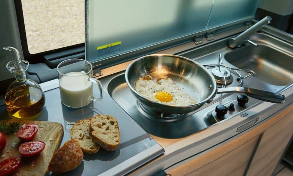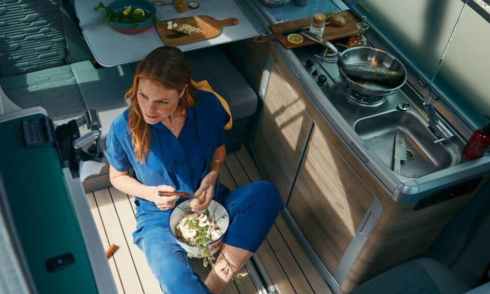 Scopri i piaceri culinari di paesi lontani mentre viaggi con la Volkswagen California 6.1. Sperimenta ricette esotiche come paella, shakshuka e letcho nel comfort della tua cucina a bordo. Dotata di piano cottura a gas, piano di lavoro e lavandino rimovibile, la California ti offre la libertà di cucinare ovunque tu vada.
