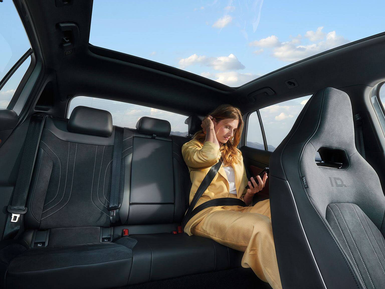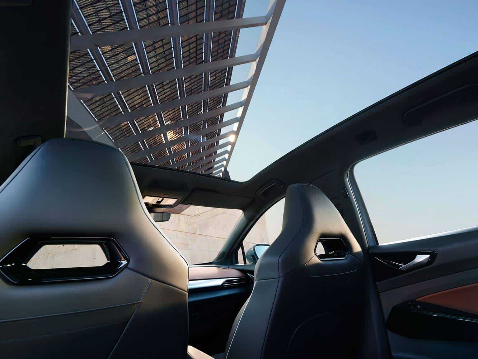 Il tetto panoramico in vetro offre una vista ampia e una connessione con il cielo. Il vetro oscurato garantisce isolamento termico. La tendina parasole avvolgibile, controllabile tramite comando vocale, protegge dall’intensa luce solare.
