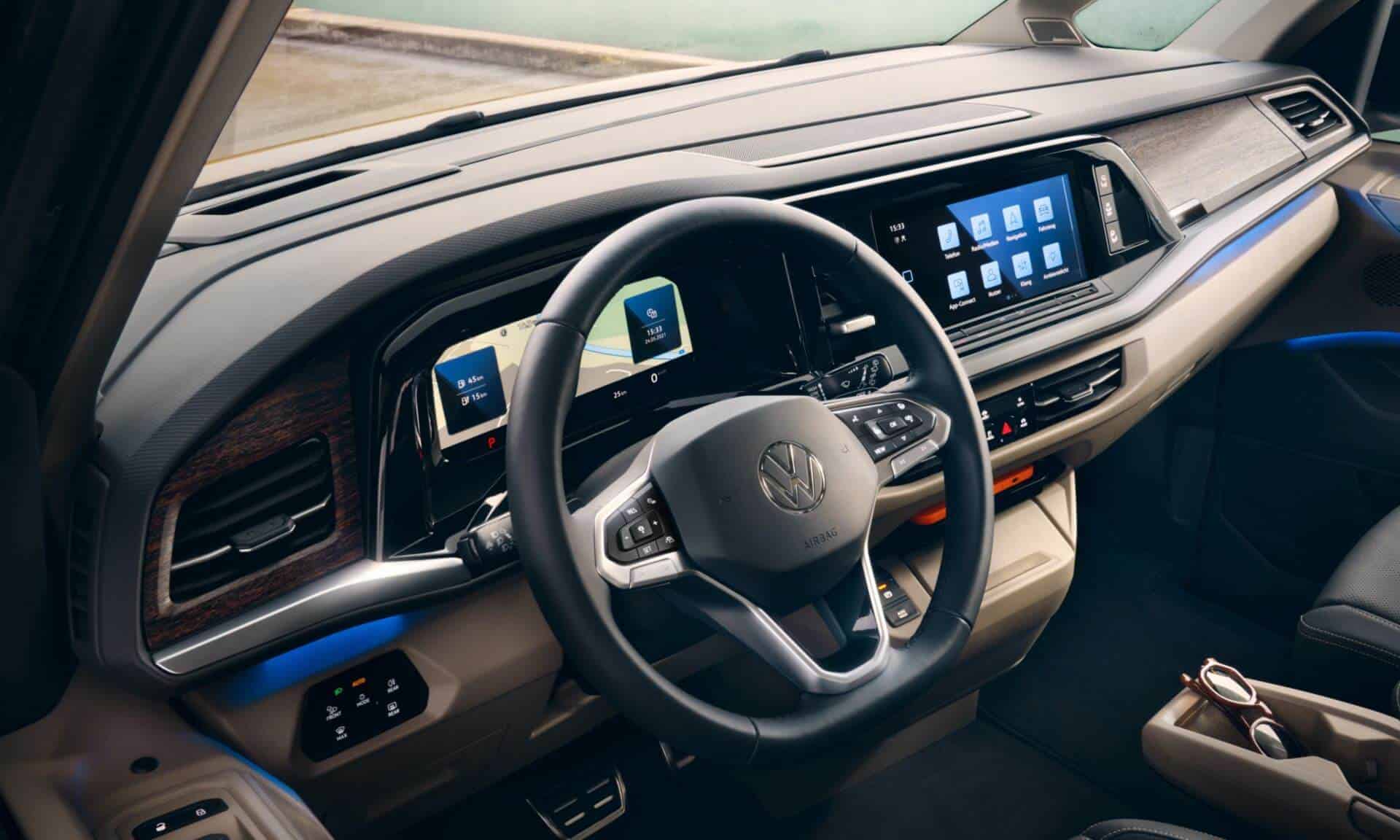 Materiali pregiati arricchiscono l’abitacolo del Nuovo Multivan, offrendo comfort e qualità di livello superiore. Il sistema di display digitale appare sospeso, mentre il volante in pelle multifunzione di serie garantisce il massimo controllo. L’illuminazione ambiente multicolore personalizza gli interni, creando un’atmosfera unica.