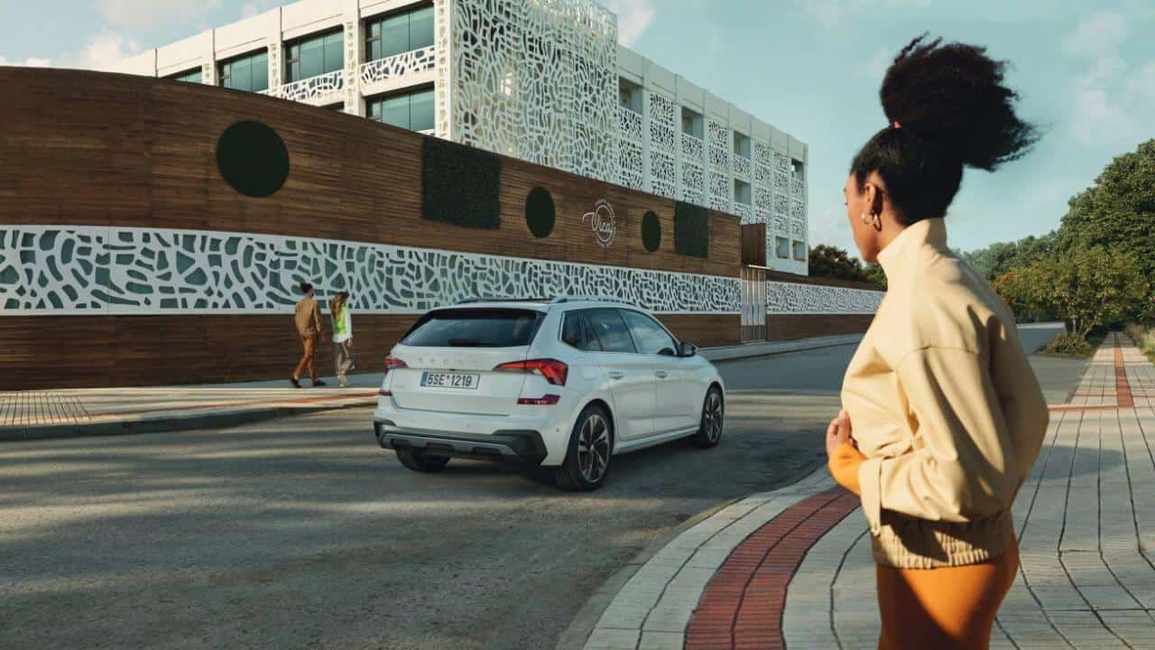 Il sistema Rear Traffic Alert di ŠKODA KAMIQ offre una maggiore sicurezza durante le manovre di retromarcia, specialmente in situazioni di parcheggio. Questo sistema riconosce i veicoli provenienti dai lati mentre si manovra in retromarcia, emettendo un allarme acustico in caso di imminente collisione. Inoltre, il display infotainment mostra la distanza dall’ostacolo. Nel caso in cui sia necessario, i freni si attivano automaticamente per prevenire eventuali collisioni.