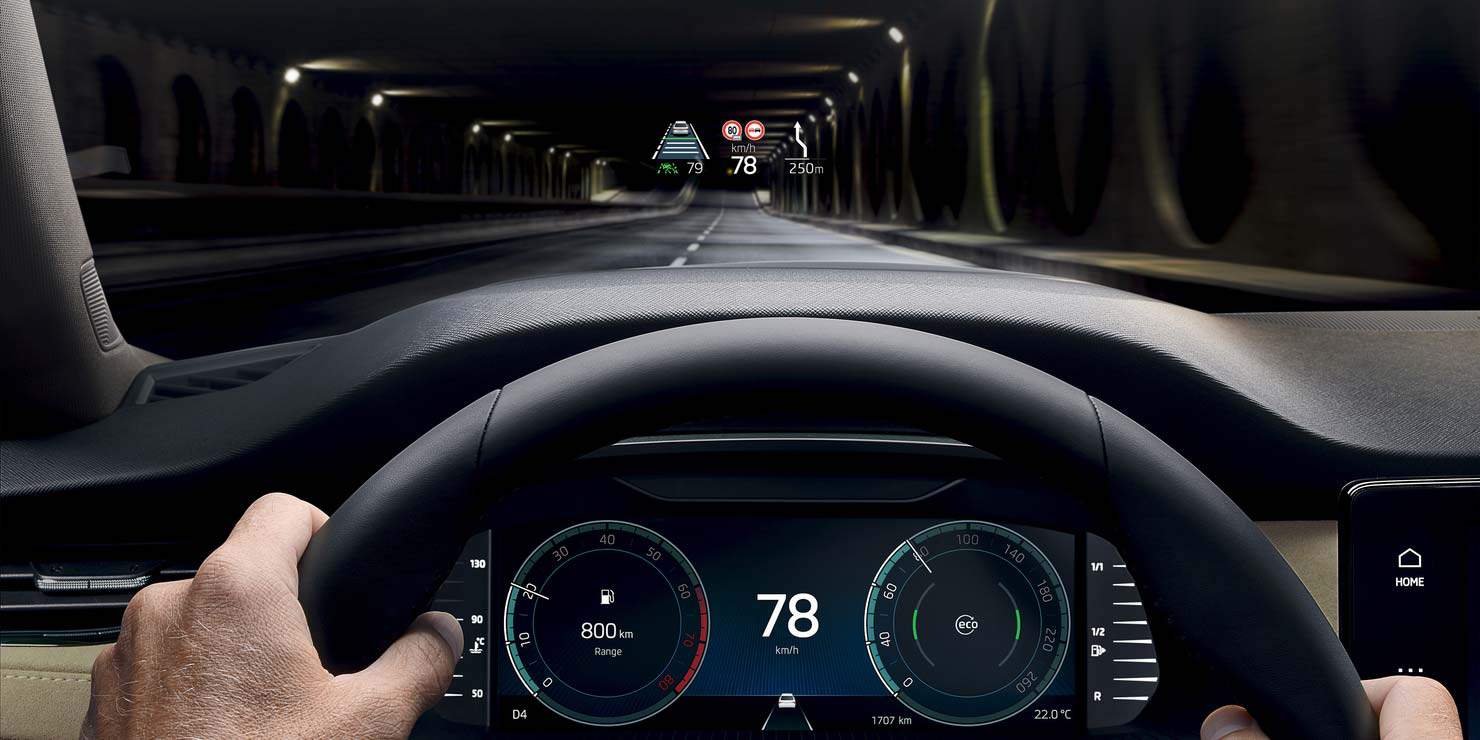 Una delle innovazioni proposte da Škoda è l’Head-up Display, che proietta velocità, istruzioni di navigazione e altre info direttamente sul parabrezza. Il Virtual Cockpit, con display a colori da 10.25”, offre quattro diverse configurazioni. Il display infotainment sulla plancia, fino a 10”, offre comodità visiva al guidatore, ospitando Apple Car Play™ e Android Auto™, oltre a news e servizi online Škoda Connect.