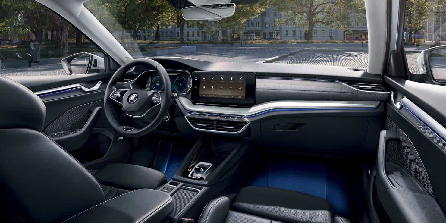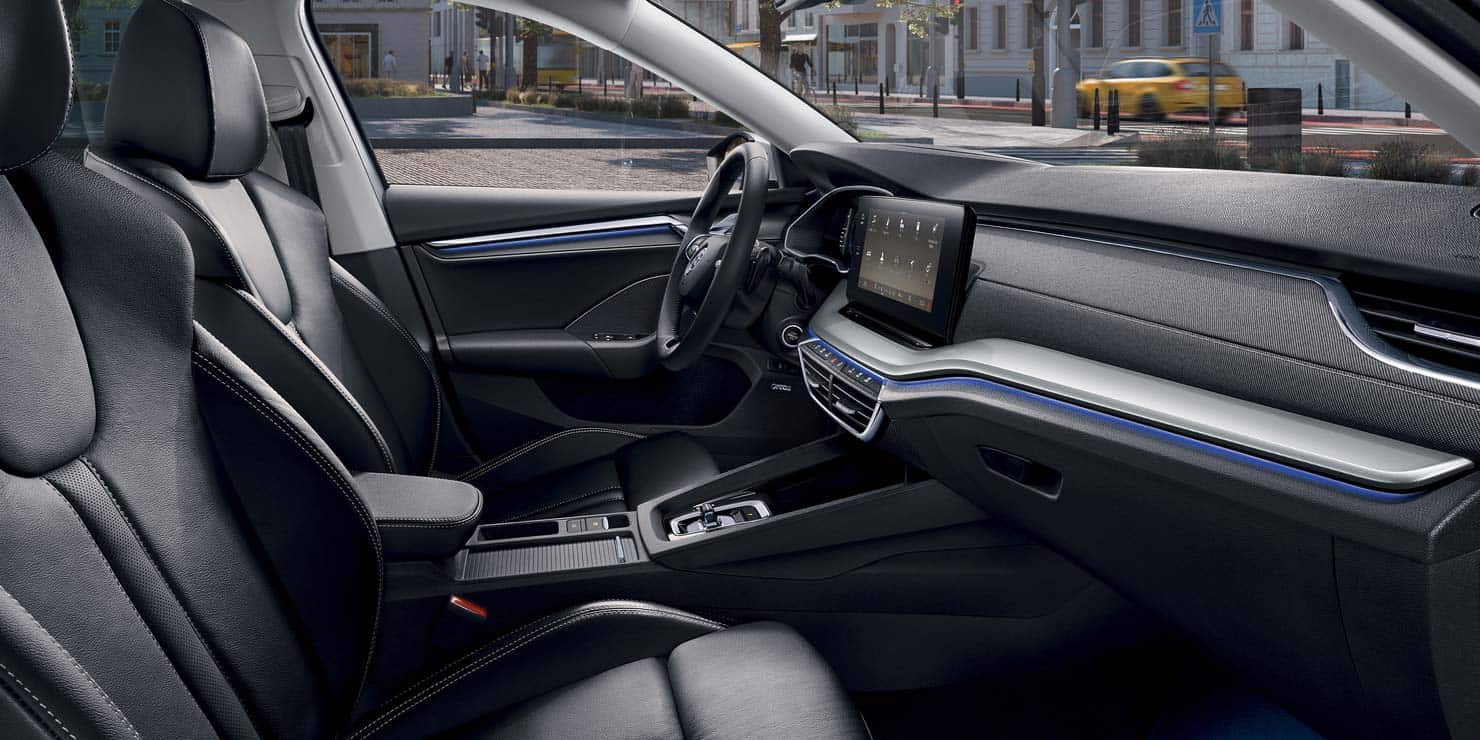 Il design elegante degli interni si contraddistingue per l’uso di materiali morbidi e di alta qualità. Dettagli cromati abbelliscono la consolle centrale, i pannelli e le maniglie delle portiere. La plancia è strutturata su vari livelli, con pulsanti di selezione diretta per le funzioni principali. Il volante a due razze, con rotelle a scorrimento, migliora il controllo. È la prima volta che troverai sedili certificati AGR con schienale e seduta ergonomici su un veicolo Škoda.