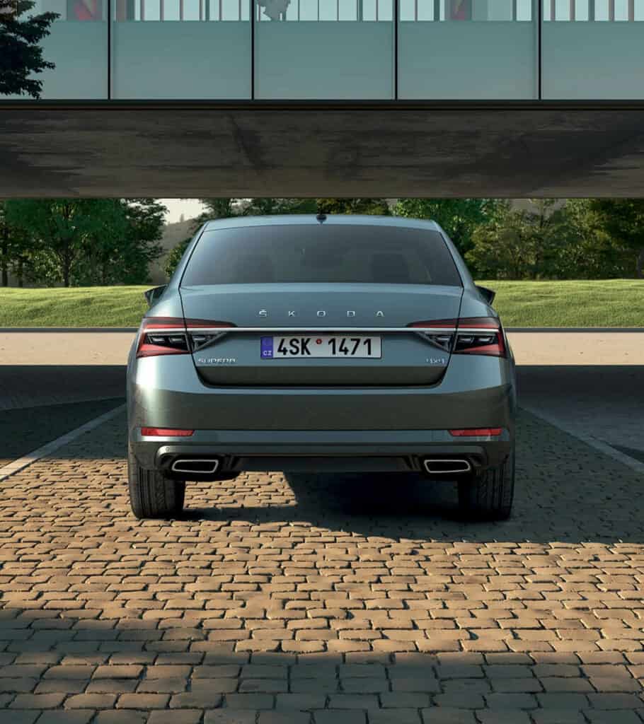 Il posteriore della Superb Wagon è stato ridisegnato e impreziosito con dettagli stilistici. La versione di punta offre indicatori di posizione dinamici, lettering Škoda al posto del logo e una finitura cromata che sottolinea l’eleganza del modello.